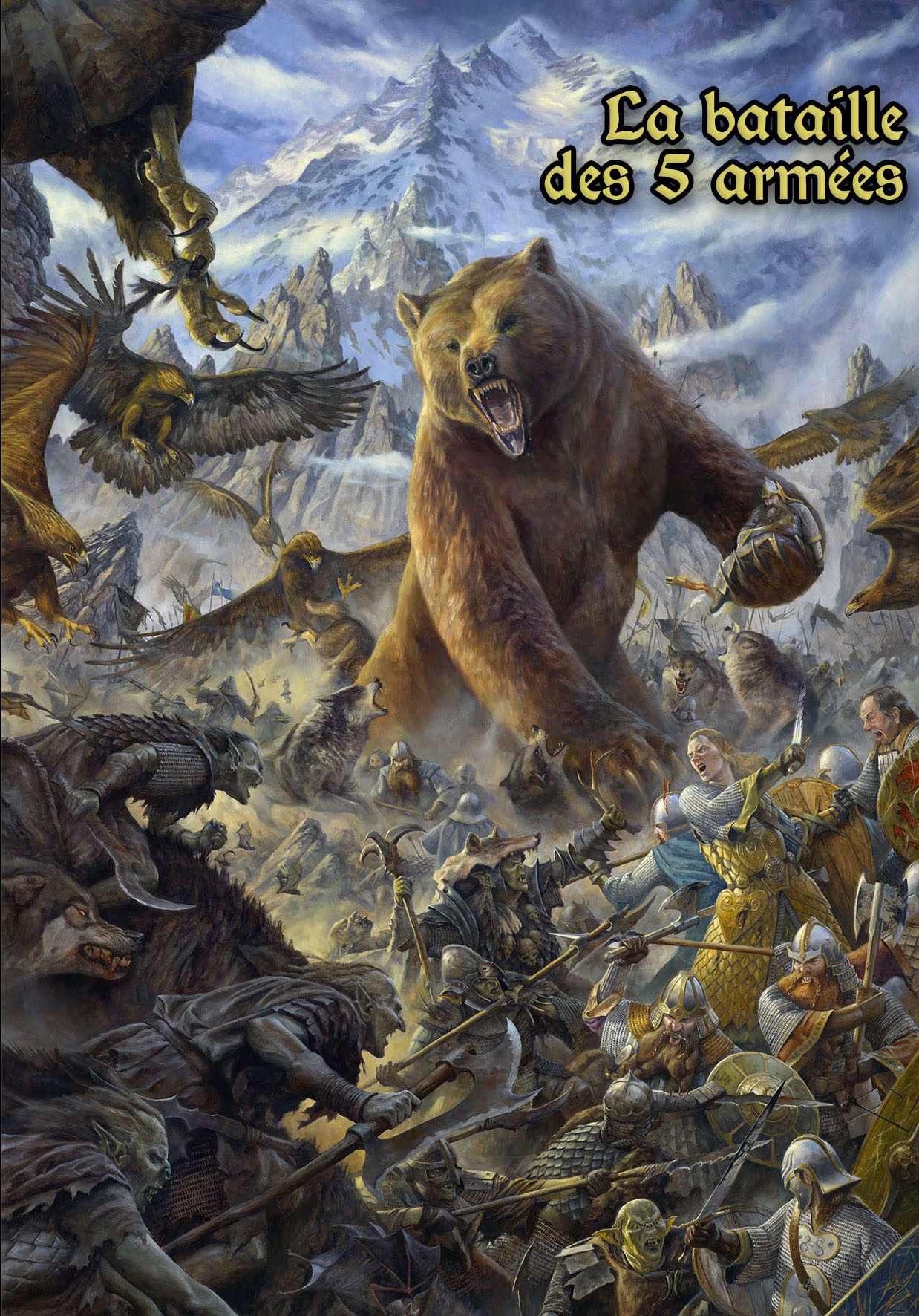 Pour Ulfied : Efles + Nains d'Erebor + Nains des monts du Fer + Hommes vs Orcs (Banière Gundabad=Montagne blanche /marron, Bannière DolGuldur=Oeil rouge/noir)