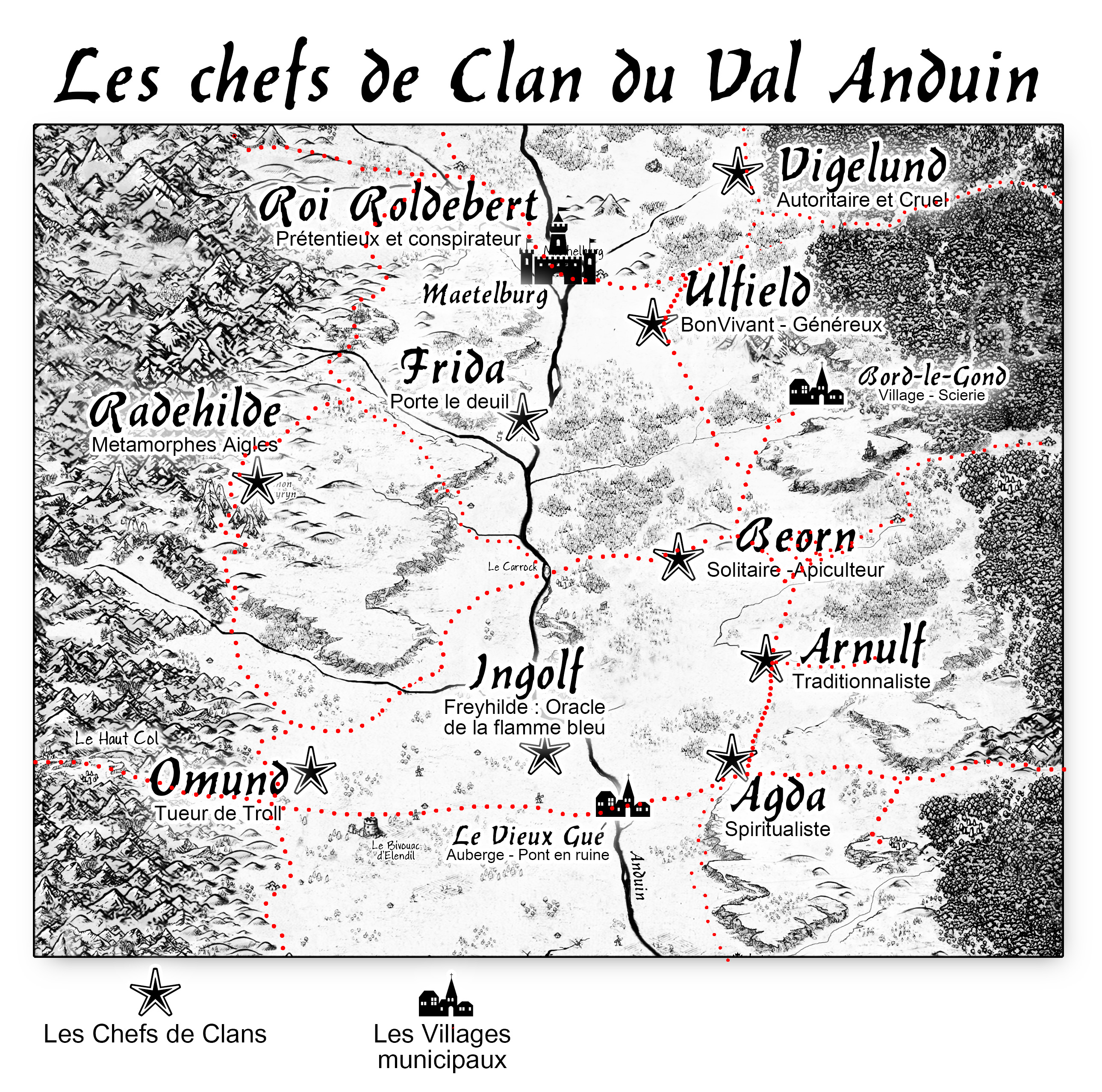 💠 Le Roi Roldebert : Même si il aime utiliser le mot "Roi" pour se designer lui-même, son veritable titre est "Alderman du haut conseil de Maethelburg" c'est à dire celui qui préside lors des conseils de l'Aristocratie de Maethelbrug. Il ne dirige donc que le conté de Maethelburg (la seule veritable "ville" du val Anduin), qui est une Aristocracie et non une Monarchie